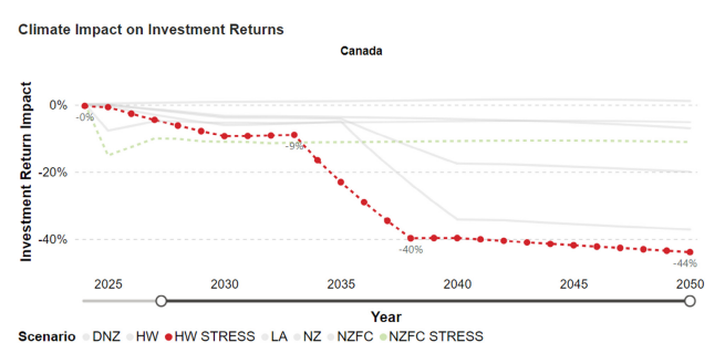 In the longer term, it is anticipated that unrestrained increases in carbon emissions in the absence of further discernable decarbonization will increase levels of physical risk, leading to severe financial impacts by the mid-2030s. In a worst-case scenario, returns in the portfolios of the top 30 Canadian pension funds could decline by up to 44%* in 2050.