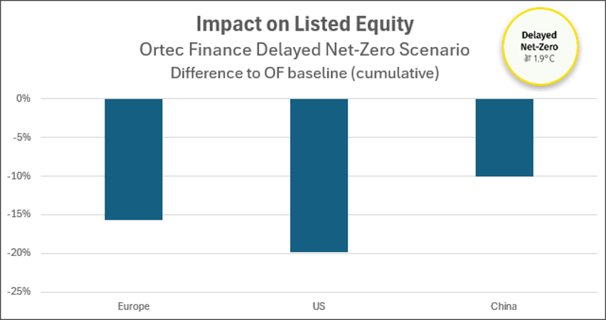 Under Ortec Finance’s Delayed Net-Zero scenario, returns on European listed equities could decline by over 15% and US listed equities around 20% by 2030.