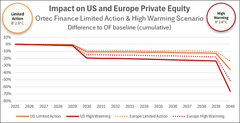 Over the same time period, US private equity underperforms by over 35% in a Limited Action scenario and over 65% in a High Warming scenario, while in Europe private equity underperforms by over 20% in a Limited Action scenario and over 50% in a High Warming scenario.