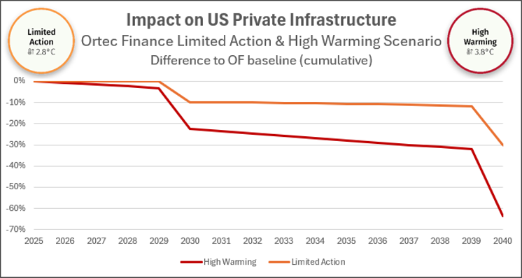 Over a 15-year time horizon, private infrastructure assets in the US will suffer a 30% loss in returns, in comparison to their baseline expectations*, under a Limited Action scenario, where temperatures increase by 2.8 °C by 2100.
