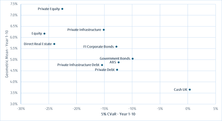 In the research paper linked to this blog, we projected forward multiple investment strategies over the next 10 years using stochastic scenarios to observe how they performed in relation to the key metrics that are of interest.