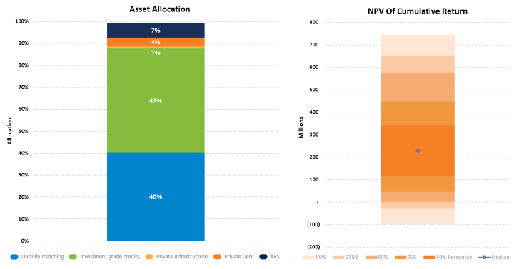 The charts below show one of the modelled investment strategies and the corresponding results of the cumulative Net Present Value (NPV) of net return (surplus extracted minus deficit contributions). This is a key metric a sponsor should be considering with this type of solution.