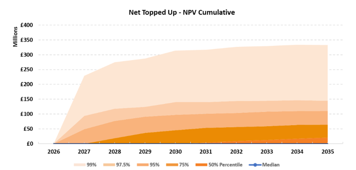 As part of the run-on framework, recovery contributions can be incorporated as an additional line of defense to protect any funding level deterioration. ALM tools can be used to assess the best ‘top-up level’ for a specific scheme and the use of stochastic modelling to understand the probability of requiring these contributions. The chart below shows the Net Present Value of deficit contributions required for a pensions scheme under the investment strategy outlined above.
