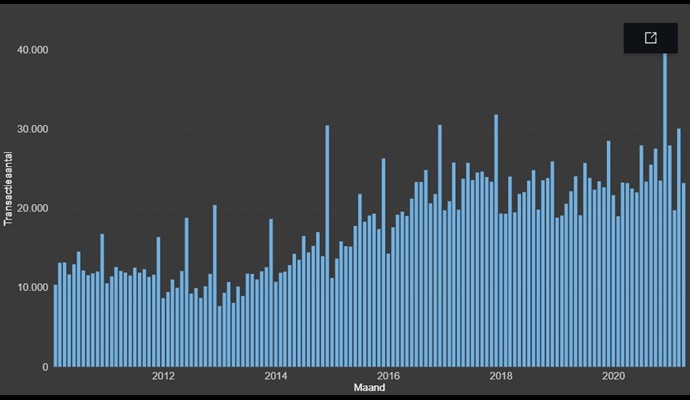 Figuur 3: In onderstaande grafiek staan de aantallen woningtransacties per maand in Nederland geplot van de afgelopen 15 jaar. Zo zijn eventuele seizoenseffecten eenvoudig zichtbaar.