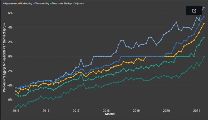 De woningmarkt staat onder spanning. De prijzen blijven stijgen en de overbiedingen op vraagprijzen nemen de laatste maanden fors toe. Zelfs bij de verkoop van vrijstaande woningen wordt er geen korting meer gegeven op de vraagprijs. Deze tendens is in maart 2018 begonnen bij de appartementen; hierbij worden de vraagprijzen inmiddels al bijna 7% overboden. Voor rijwoningen wordt 5% meer betaald dan de vraagprijs terwijl de koopsommen van twee-onder-een-kapwoningen ruim 2,5% hoger zijn dan de vraagprijs. Zie figuur 1.