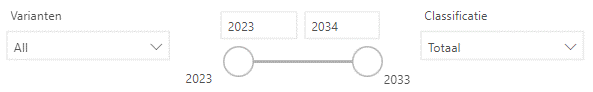 Als je de varianten in het WALS Dashboard verder wilt analyseren, is het handig om in te kunnen zoomen op de DAEB de niet-DAEB tak. Niet elke beleidsvariant heeft namelijk dezelfde impact op de verschillende bedrijfstakken. Daarom kun je door de “Classificatie” aan te passen de gewenste resultaten bekijken. Daarnaast is het mogelijk om de financiële resultaten grafisch weer te geven voor een bepaalde periode, zie afbeelding hieronder. Deze twee functies zijn boven in het Dashboard te vinden.