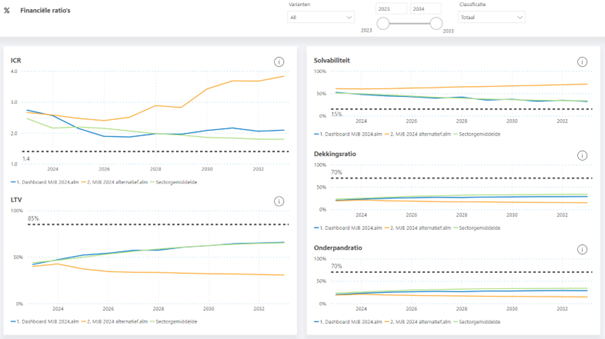Nu de resultaten in het Dashboard staan, is het tijd om de resultaten te analyseren. Hieronder zijn als voorbeeld 2 varianten weergegeven. Één basisvariant en één alternatief scenario. De derde lijn, het sectorgemiddelde, is automatisch zichtbaar in een aantal rapporten.