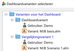 De WALS-gebruiker geeft in WALS aan welke varianten in het dashboard worden getoond. Dit doet de WALS-gebruiker via de knop ‘Varianten selecteren’. We maken hierbij onderscheid tussen de dashboardvariant, en één of meerdere vergelijkingsvarianten.