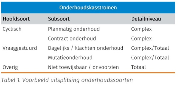 Op strategisch niveau (portefeuillemanagement) worden doelstellingen en budgetten bepaald. Hiervoor is het belangrijk om vooraf de soorten onderhoud uit te splitsen waarop de corporatie wil sturen. Op deze uitsplitsing kan vervolgens begroot en gemonitord worden. In onderstaande tabel zijn de verschillende soorten onderhoudskasstromen opgenomen.