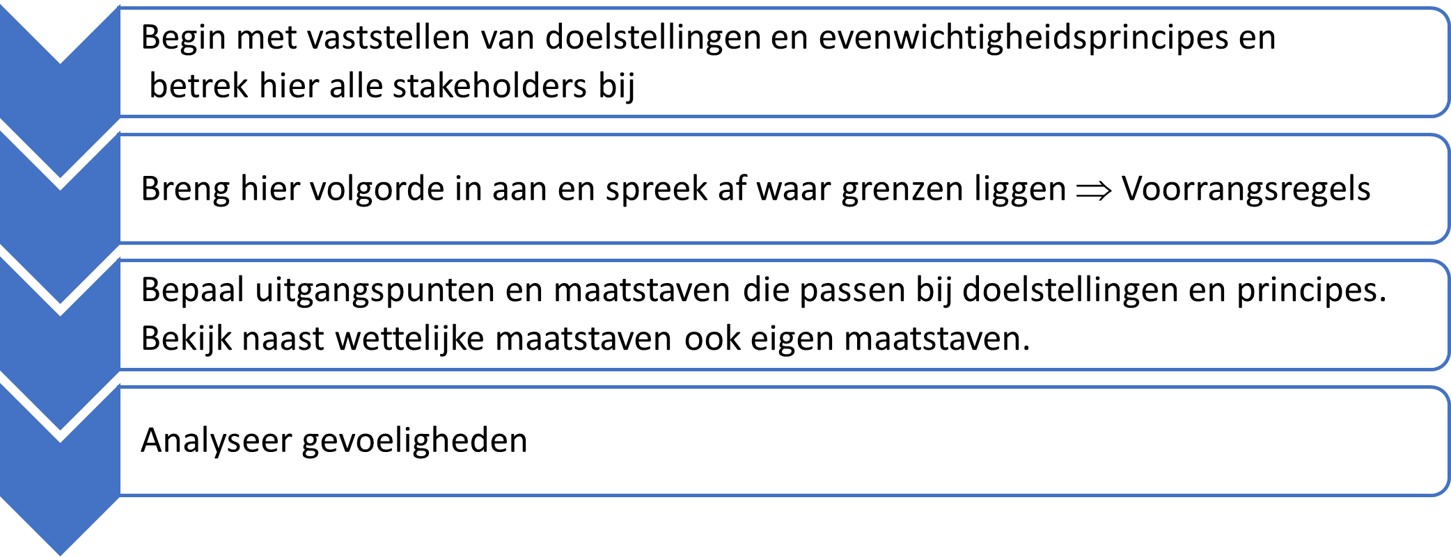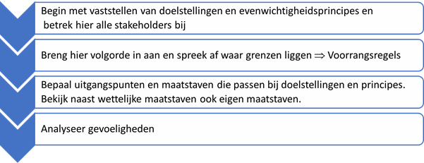 Bij het vaststellen van voorrangsregels wordt vastgelegd hoe de verschillende doelstellingen geprioriteerd worden. Welk van de gedefinieerde principes is een must have en op welk principe kunnen als het moet concessies worden gedaan?