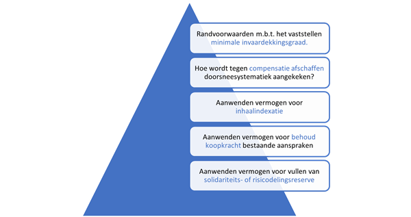 - De mate waarin het bij verdeling van het bestaande vermogen rekening gehouden wordt met het benodigde vermogen voor koopkrachtbehoud van bestaande aanspraken;