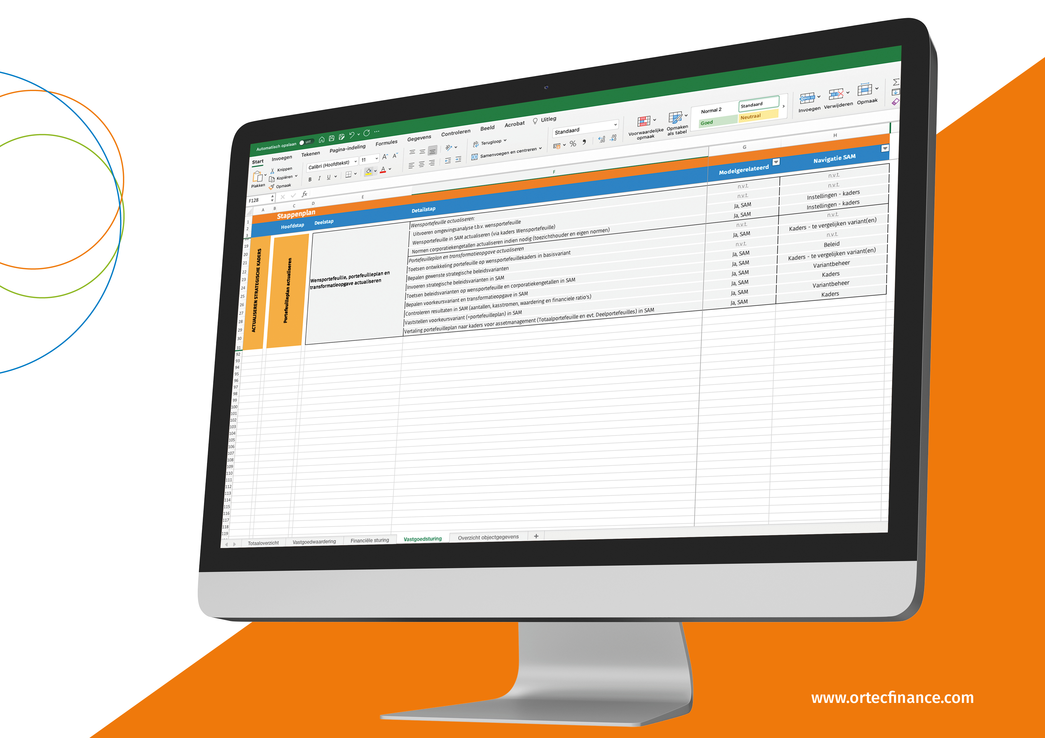 Als je in het totaaloverzicht van de jaarcyclus klikt op ‘portefeuilleplan actualiseren’, kom je terecht op de juiste plek op het tabblad vastgoedsturing. Deze afbeelding gaat tot en met de kolom ‘Navigatie SAM’. De checklist gaat verder met bijvoorbeeld het benoemen van de verantwoordelijke, de bron van de gegevens, de planning en de status.