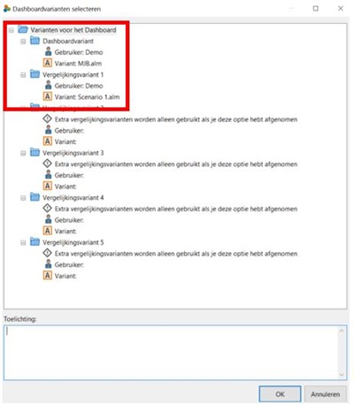 De eerste stap, het koppelen van een dataset in WALS, blijft ongewijzigd. Hierin selecteer je de gewenste varianten die je wil presenteren in het Dashboard. Let wel op dat het noodzakelijk is dat de varianten geen foutmeldingen tonen bij het doorrekenen in WALS. Anders komen de varianten niet in het WALS Dashboard.