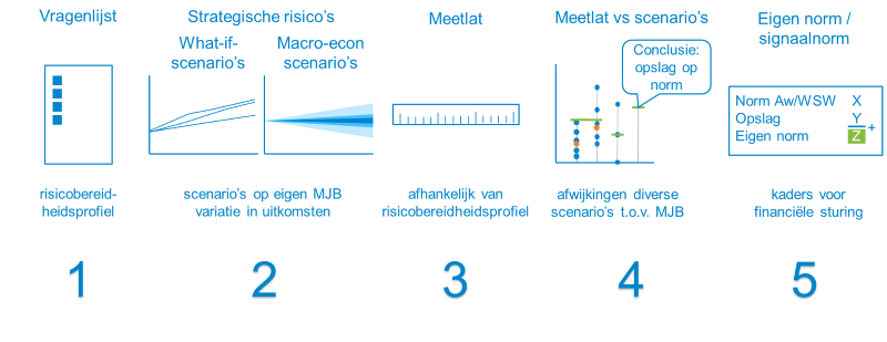 We werken in vijf stappen toe naar een opslag (ICR, solvabiliteit) of een afslag (LTV) op de normen voor de financiële kengetallen. Dit is schematisch weergegeven in onderstaande figuur.