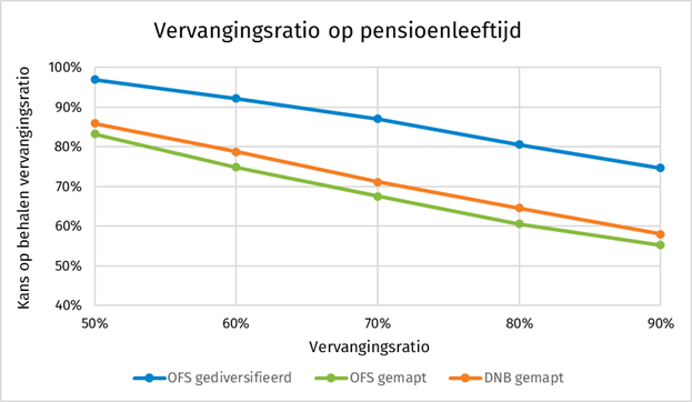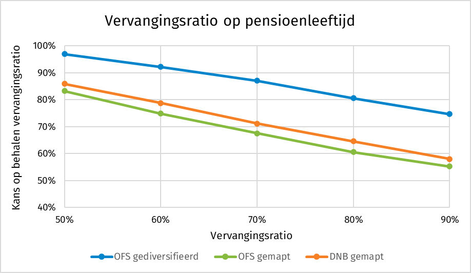 In de grafiek hieronder wordt voor een voorbeeldfonds voor vervangingsratio’s van 50% tot 90% (horizontale as) getoond wat de kans is dat een 25-jarige deelnemer deze vervangingsratio bereikt (verticale as). De blauwe lijn is gebaseerd op basis van de Ortec Finance Scenario’s (OFS) en een gediversifieerde beleggingsportefeuille. Bij de groene lijn wordt nog steeds gerekend met de OFS, maar is de gediversifieerde portefeuille ‘gemapt’ naar aandelen en vastrentende waarden, waardoor er geen sprake meer is van diversificatie binnen de return- en binnen de matchingportefeuille. Deze mapping is gedaan volgens de wettelijk voorgeschreven methode. De oranje lijn toont vervolgens de uitkomsten op basis van de uniforme scenario’s van DNB.