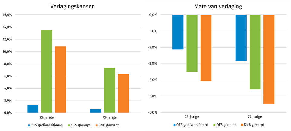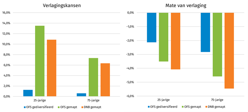 Bij alle varianten is uitgegaan van een solidariteitsreserve die erop gericht is nominale verlagingen van het pensioen te voorkomen. De linker grafiek maakt duidelijk dat dit bij de variant op basis van de OFS en een gediversifieerde portefeuille een stuk beter lukt dan in de andere varianten zonder diversificatie. Ook de mate van verlagingen (rechter grafiek) ligt lager in deze variant.