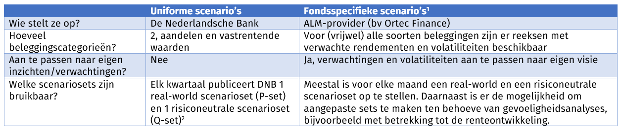 De onderstaande tabel toont de belangrijkste verschillen tussen de uniforme scenariosets van DNB en fondsspecifieke scenariosets: