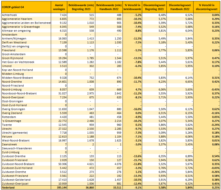 Omdat veruit het grootste effect de disconteringsvoet betreft, hebben we onderzocht wat het verschil is in de beleidswaarde en de disconteringsvoet tussen de begrote beleidswaarde per ultimo 2022 (handboek 2021) en de beleidswaarde op basis van het handboek 2022. Alleen basiswaarderingen en woningtypes EGW en MGW zijn meegenomen. Deze analyse is uitgevoerd per COROP-gebied, voor de G4 (Amsterdam, ’s-Gravenhage, Rotterdam en Utrecht) en voor heel Nederland. In de grote steden en in de regio’s die door het handboek zijn aangemerkt als fullregio’s of aardbevingsgebieden zijn er in ons onderzoek relatief gezien minder woningen aanwezig, omdat deze over het algemeen gewaardeerd worden met de full waardering en om deze reden buiten beschouwing worden gelaten.