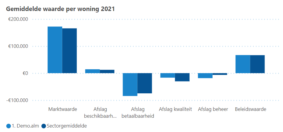 Figuur 1: Gemiddelde marktwaarde, afslagen en beleidswaarde in het WALS Dashboard Pro (demo)
