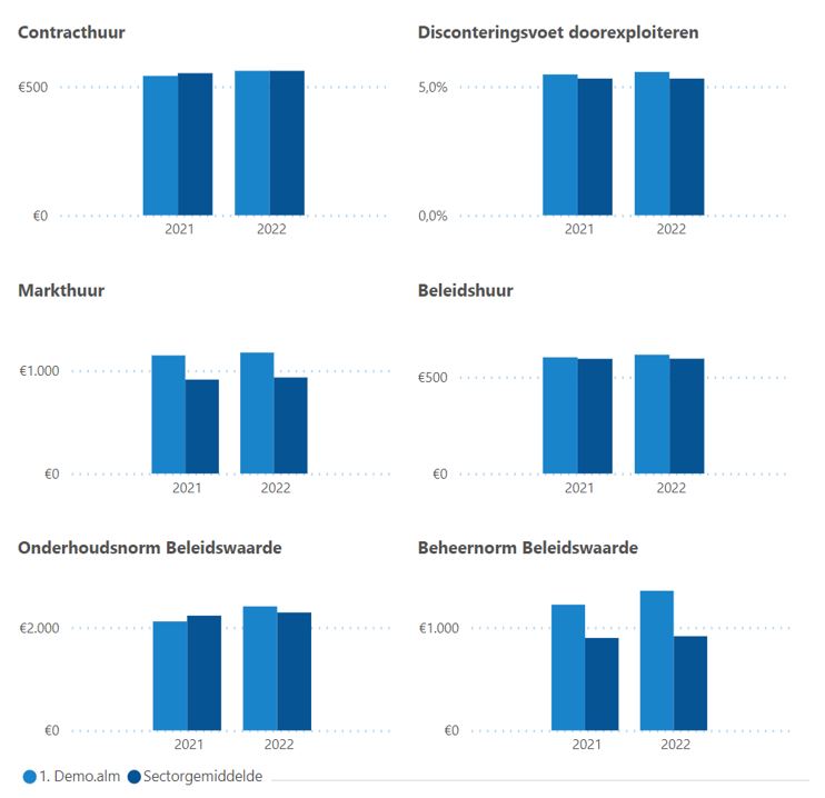 Daarnaast kun je zien op welke uitgangspunten de beleidswaarde is gebaseerd en deze vergelijken met het sectorgemiddelde. Denk bijvoorbeeld aan de beleidshuur, de disconteringsvoet of de onderhoudsnorm. Zie figuur 2.