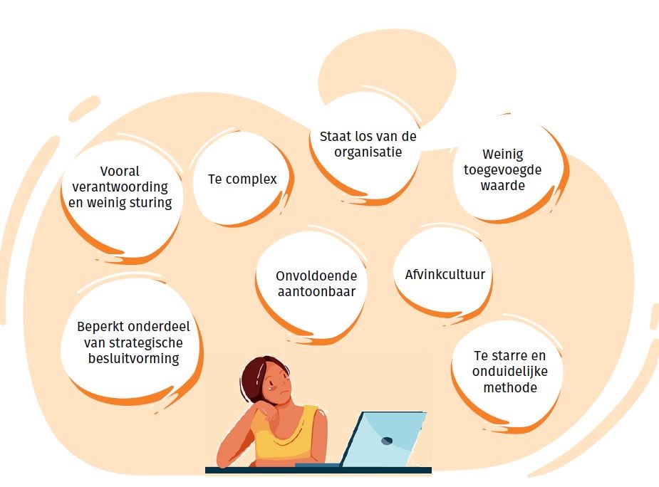 Vaak wordt er gebruik gemaakt van modellen en richtlijnen zoals COSO, COBIT of ISO aangevuld met templates, checklists en standaard rapportages. Die vult het bestuur niet zelf in, dat wordt gevraagd aan de uitvoering zoals bestuursbureau, commissies of uitvoerders. Dit kan ertoe leiden dat het risicomanagement wordt gezien als een afvink oefening die los staat van de dagelijkse activiteiten. Mogelijk is risicomanagement ook nog ondergebracht in een afzonderlijke commissies met haar eigen taken en verantwoordelijkheden. En beheersen commissies de diverse risico’s daardoor los van elkaar.